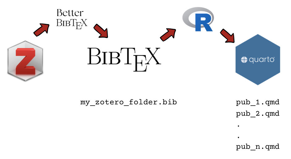 The pieces: 1. A Quarto website where you want to show your publications (and other academic outputs) 2. A Zotero collection/folder where you save your publications (and other academic outputs) 3. A synced bibtex file from Zotero, whih runs autonmatically thorough the add-on BetterBibTex 4. An R script that extracts information from the bibtex file and generates markdown files for each publication in the academic website; let’s call it bibtex2quarto.R